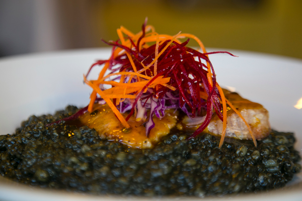 Atún a la plancha bañado salsa maracuyá y acompañado con un quinoto al azafrán.