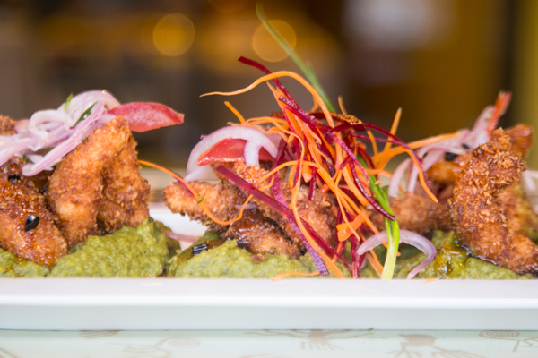 Camarones empanizados, con puré verde. bañado en salsa de maracuyá.