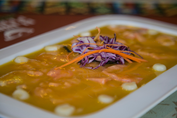 Finas láminas de salmón marinado en salsa de mango.