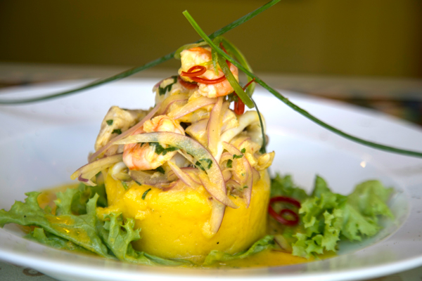 Papa amarilla prensada, aliñada en un punto de ají amarillo, coronado con ceviche mixto.