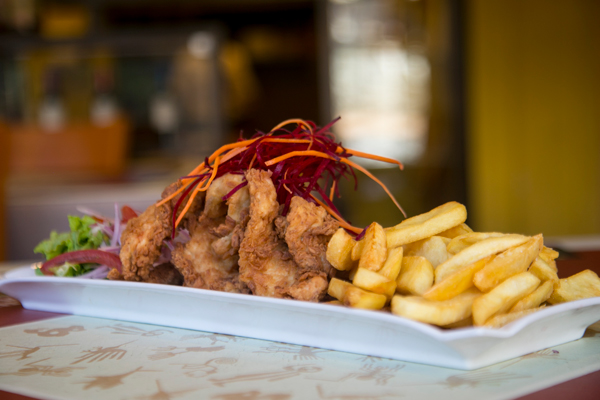 Trozos de pollo apanados fritos, servidos con papas fritas y tártara.