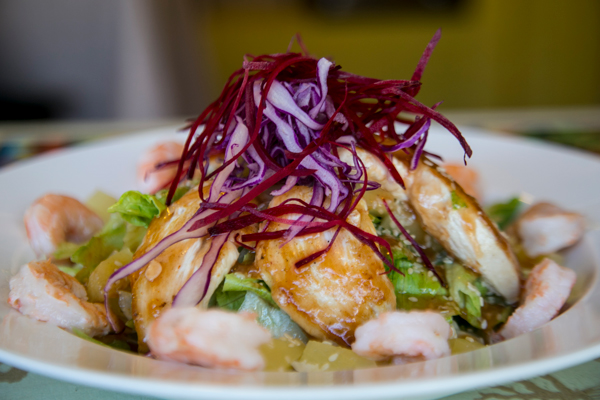 Lechugas, filetillo de pollo, camarones, piña y semillas de ajonjolí, bañado en su propia salsa.