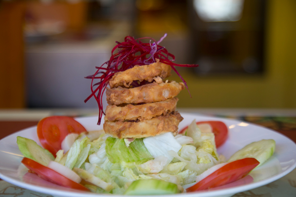 Lechugas, espinacas, palmitos, tomates, pepinos, alcachofa y cebolla crocante en salsa de mostaza y miel.