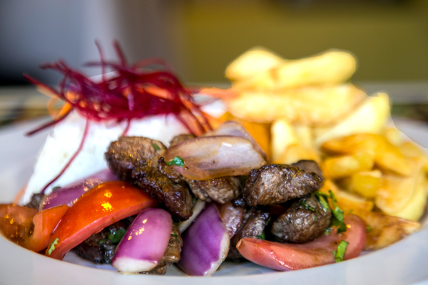 Trozos de filete de vacuno, salteados con cebolla, tomate y especies, acompañados con papas fritas y arroz.