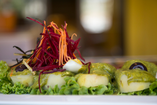 Papas cocidas, bañadas en salsa de huacatay, queso fresco,galletas,maní y leche.