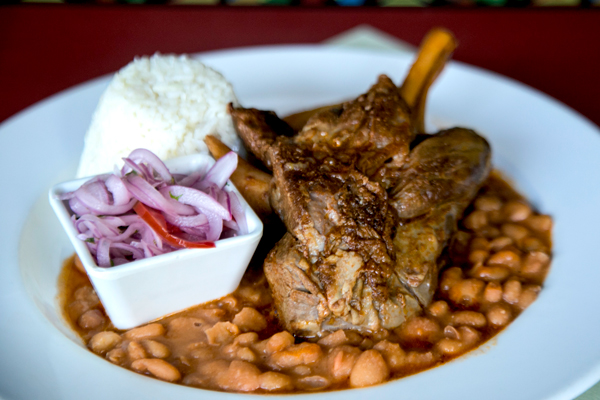 Delicioso garrón de cordero al estilo norteño, con yuca y arroz blanco.