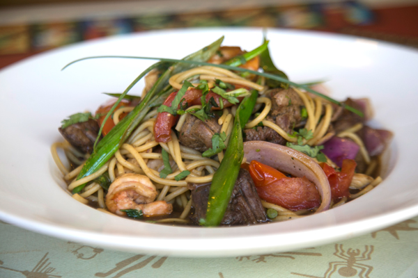 Pollo, carne y camarones, salteados al wok con cebolla tomate, cebollín y salsa de soya.